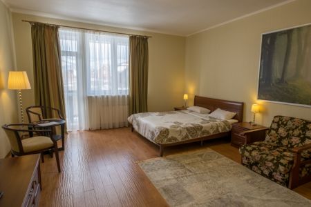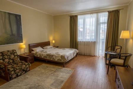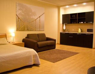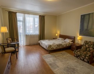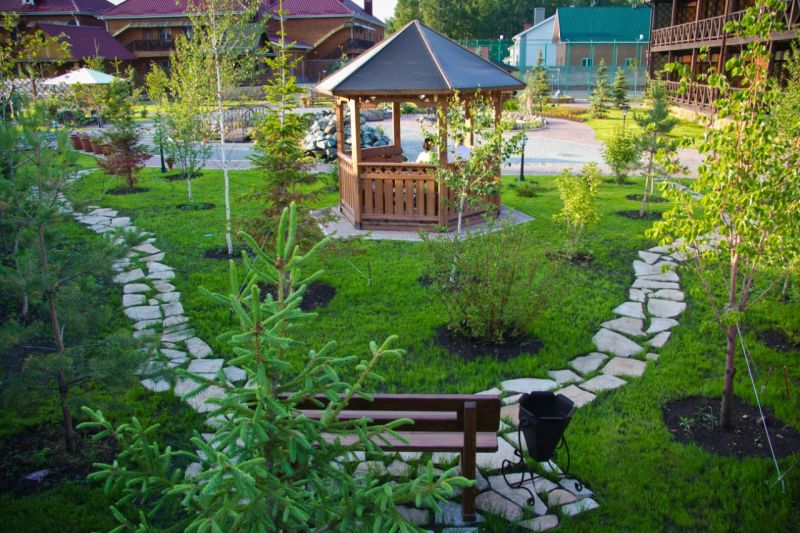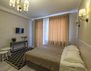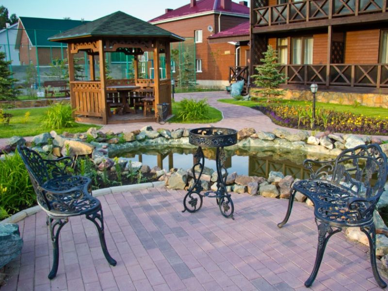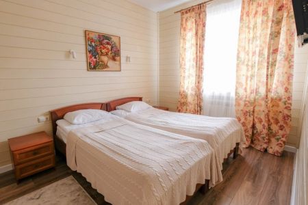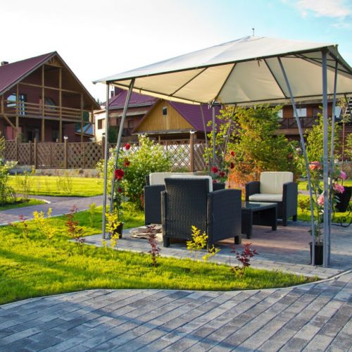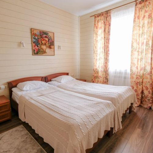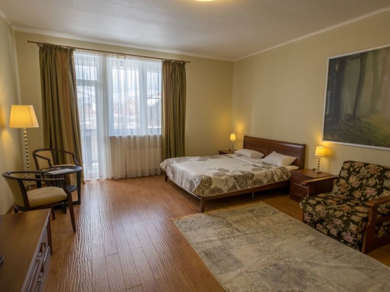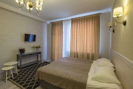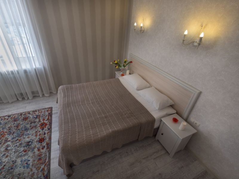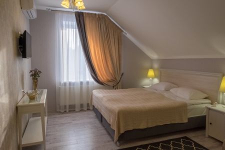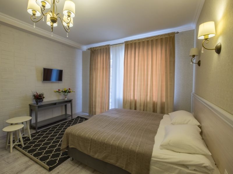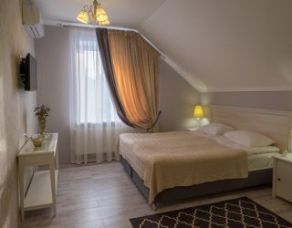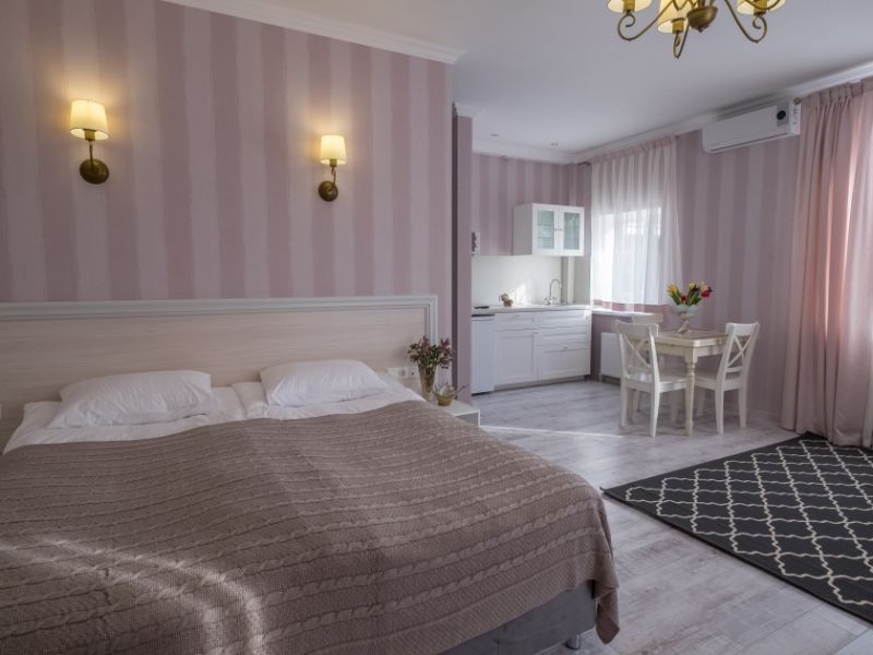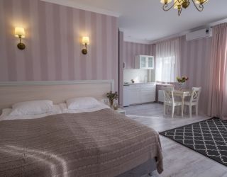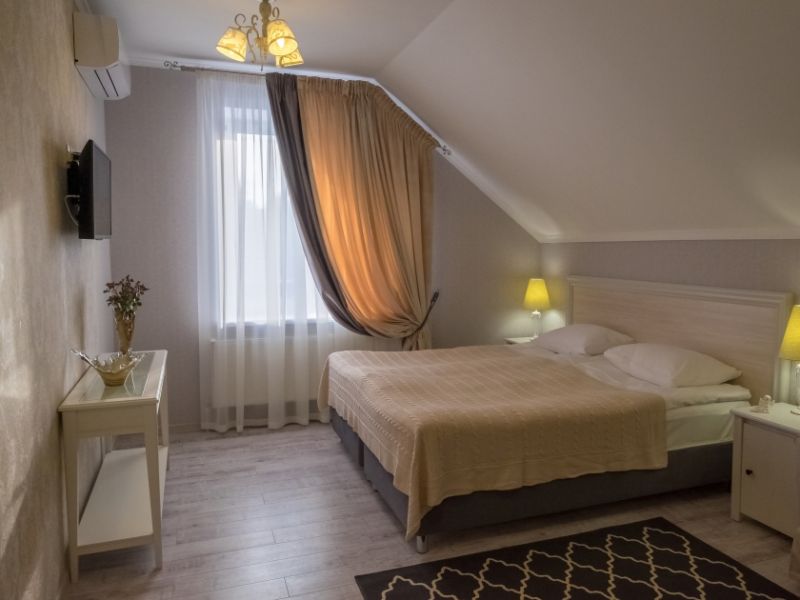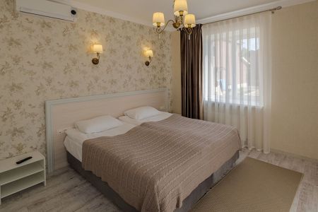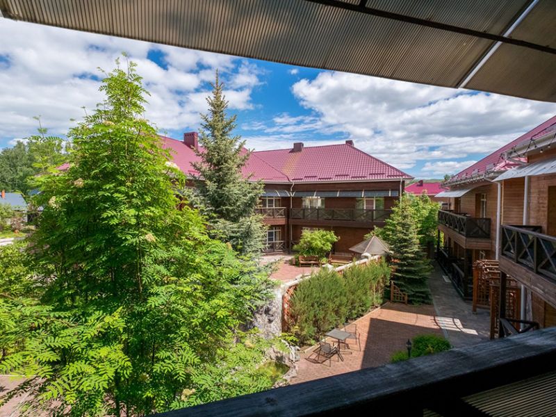 Комплекс занимает закрытую благоустроенную территорию с цветниками, клумбами, фонтанчиком, в темное время суток работает ночная подсветка. В распоряжении гостей 4 двухэтажных корпуса с персональным входом в каждый номер. Все номера оснащены удобными кроватями, диванами, организованы кухонные зоны с посудой и бытовой техникой. Ряд номеров оборудован посудомоечной и стиральной машинами. В индивидуальном санузле – душевая кабина или ванна, для гостей подготовлены косметические принадлежности.